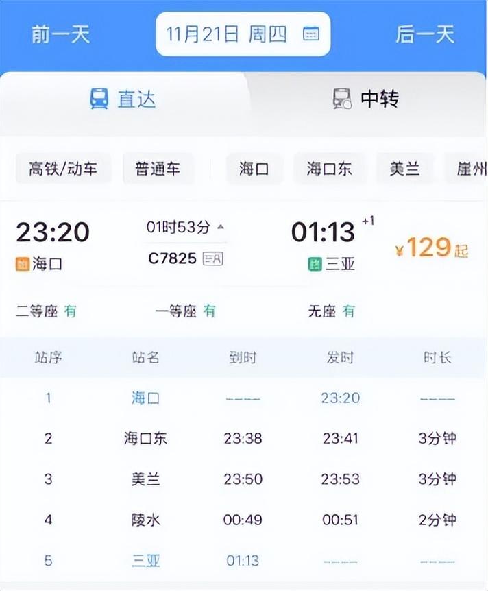 海南铁路方面特别公布,11月21日将增开(C7825次)海口至三亚的动车组服务,23:20海口站(即海口火车站)始发,经停海口东站、美兰站、陵水站,到达三亚站,确保每位粉丝都能便捷地到达与返回。