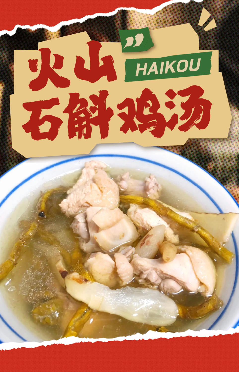 海口火山石斛,羊山火山地貌群种植,石斛自古被视为养生之上品。石斛鸡汤是一道以鸡肉、石斛、茯苓片为主要食材制作而成的一道美食。做法简单,营养丰富,极具有滋补功效。