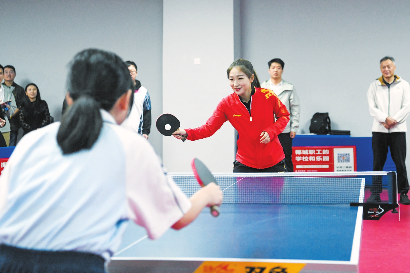 国际乒联运动员委员会主席、世界冠军刘诗雯与乒乓球爱好者“比拼”。本报记者 杨鹤 摄
