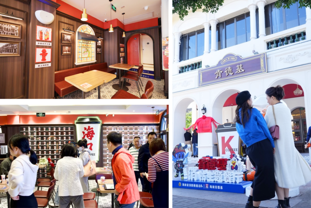 消防X骑楼风格的肯德基消防安全主题餐厅来啦!充满年代感的南洋风设计,搭配精致复古的桌椅摆设,从餐厅外的小花园一路通过走廊进入餐厅,一个个消防标志标识和IP蓝宝随处可见,让人们沉浸其中又多了一种满满的安全感。主题餐厅还分区规划了不同的消防科普场景,搭配了趣味多多的消防小游戏,可以在享受美食的过程中,零距离接触消防安全知识,遇上主题活动,还有消防小礼品可以拿到手哟!