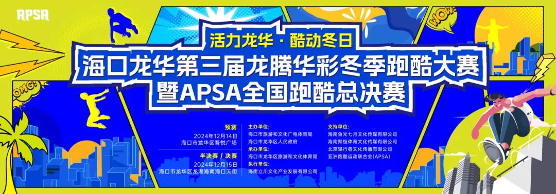 本次赛事由海口市龙华区人民政府主办,海口市龙华区旅游和文化体育局承办,赛事不仅规格高,水平高,还将潮流运动与商圈消费融合。比赛设个人竞速赛、团体接力竞速赛、个人追逐赛三个项目,分为U6、U8、U10、U12组和青少年组及成人组六个年龄组别。此外,APSA全国跑酷总决赛的竞赛内容为个人竞速赛决赛。