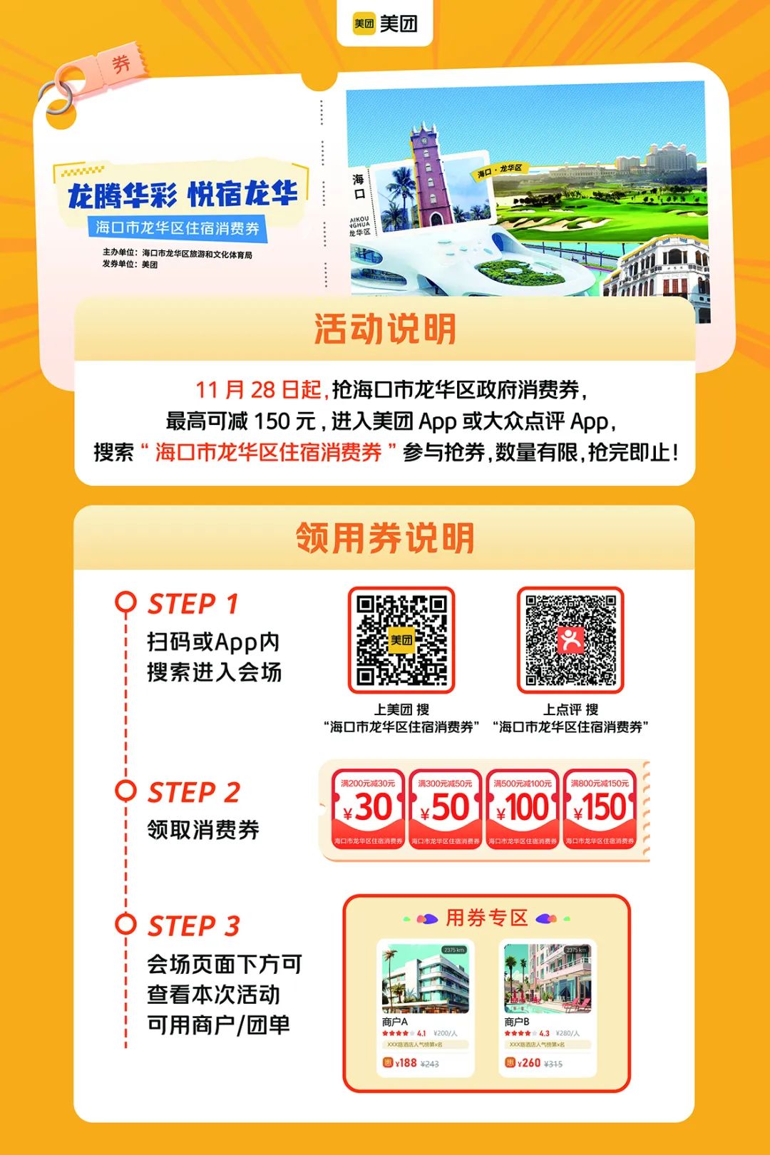 即日起至2025年1月1日,海口市龙华区旅游和文化体育局联合美团平台推出“龙腾华彩,悦宿龙华”海口龙华2024酒店消费券,涵盖龙华区域内多家精品酒店。前来参赛的选手或观赛的观众们可以通过登录美团App、大众点评App,搜索 “海口龙华消费券”,或通过首页相应主题入口进入活动页面,点击“领取”按钮即可领券,惠享冬日暖阳度假新风尚。