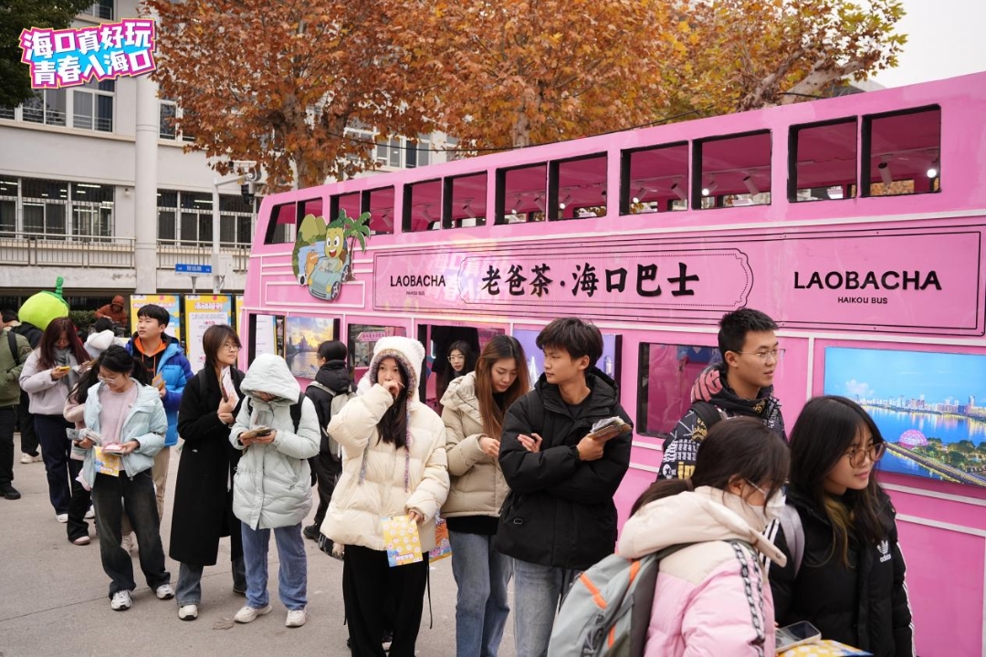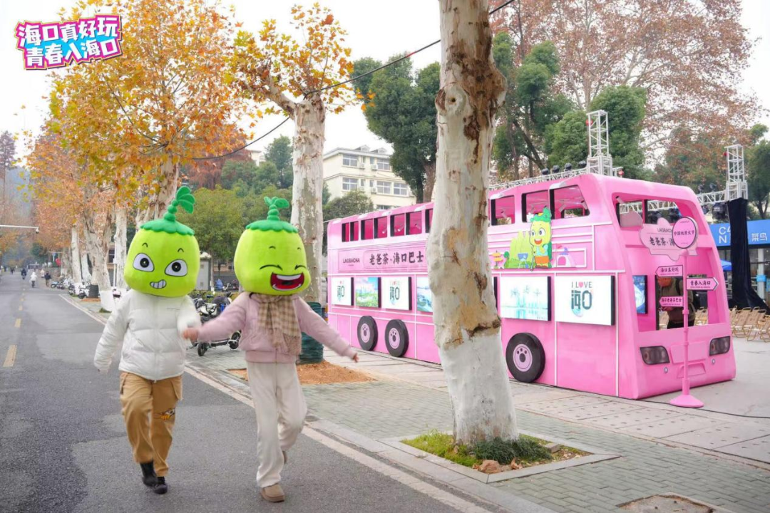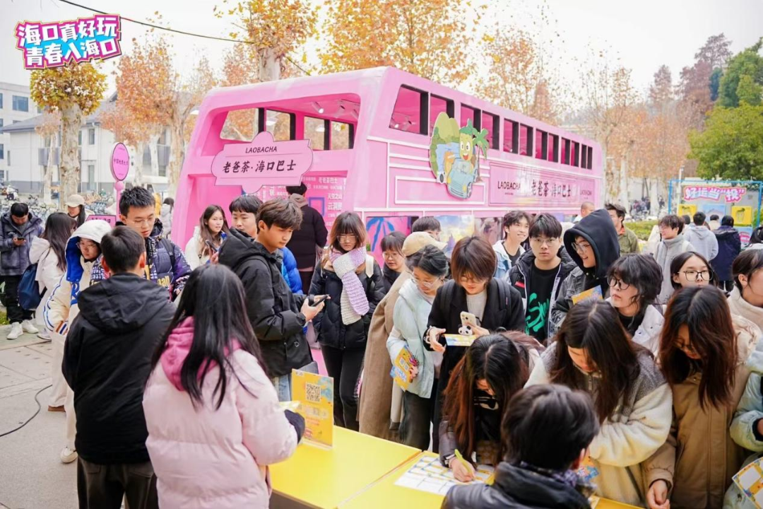 在中国地质大学校园内,粉色的老爸茶海口巴士带着热带滨海城市的热情闪现,活动现场热闹非凡,同学们踊跃“登上”老爸茶海口巴士打卡拍照,在许愿墙上许愿、体验海口旅游风光、特色表演、游戏互动等多个环节,现场还吸引了来自海口的学子上台推介自己的家乡,邀请同学们寒假去海口玩。