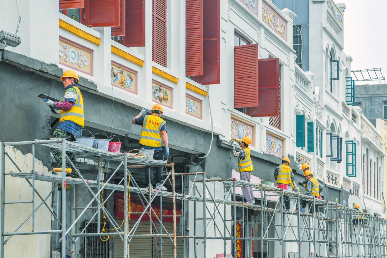 12月27日,在海口骑楼历史文化街区博爱路保护修缮项目现场,施工人员在修缮外墙。 本报记者 孙士杰 摄