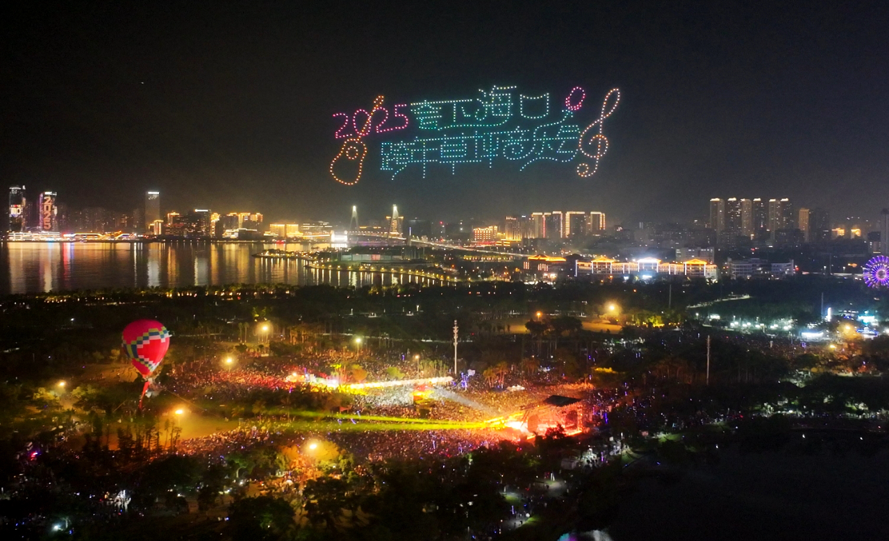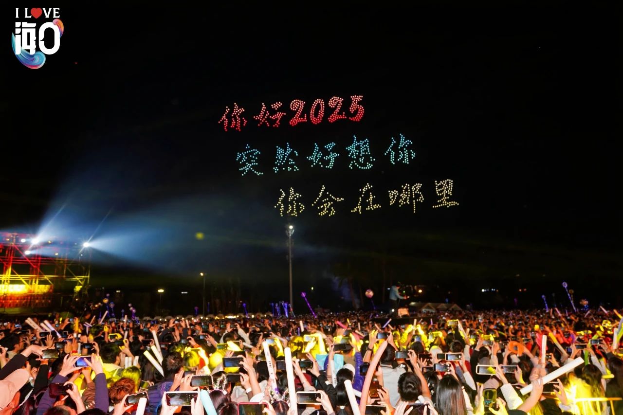 零点跨年时刻,“5、4、3、2、1,新年快乐!”全场数万人齐声倒数,千架无人机在夜幕中列阵登场,点燃现场激情。短短16分钟,变换出14种海口元素画面,将辞旧迎新的美好祝福印在夜幕之上,观众纷纷举起手机,定格这震撼瞬间,共同迎接2025年的到来。