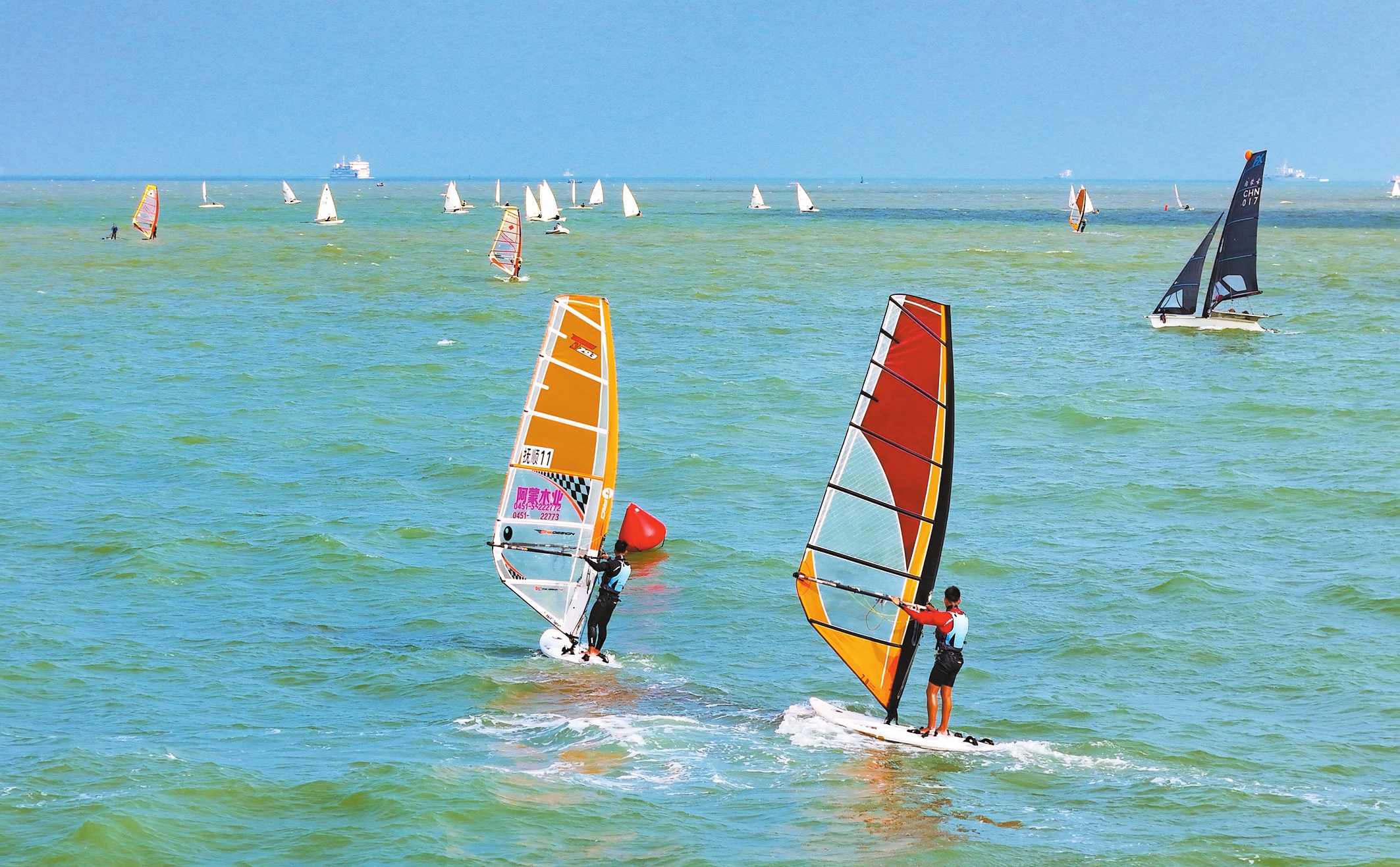 1月7日,在位于海口西海岸的海口国家帆船帆板训练基地附近海域,来自全国各地的帆船帆板队在一望无际的海面上训练,多彩船帆与碧海蓝天相互映衬,形成一道亮丽的城市风景线。