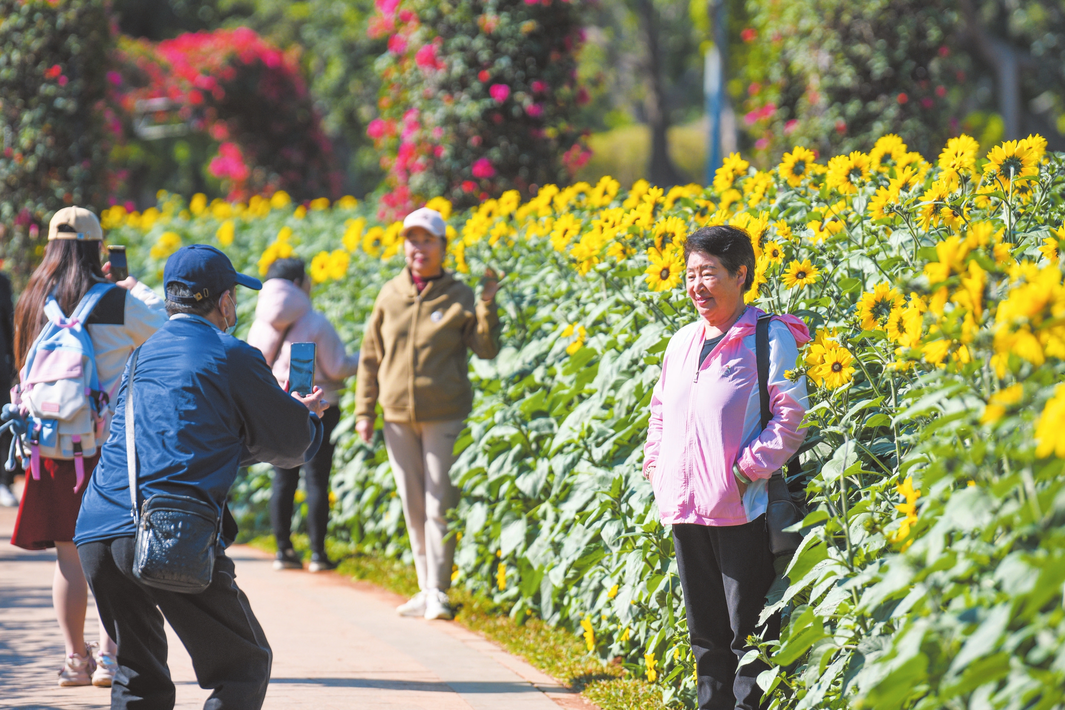 1月12日,海口万绿园盛开的向日葵花,吸引众多市民游客前来拍照打卡。