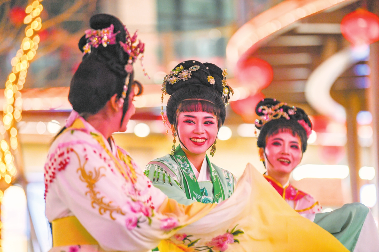 1月22日,友谊·国贸城中庭广场红灯高挂,一名留学生(左一)正跟随中国琼剧演员(左二)进行彩排。本报记者 康登淋 摄