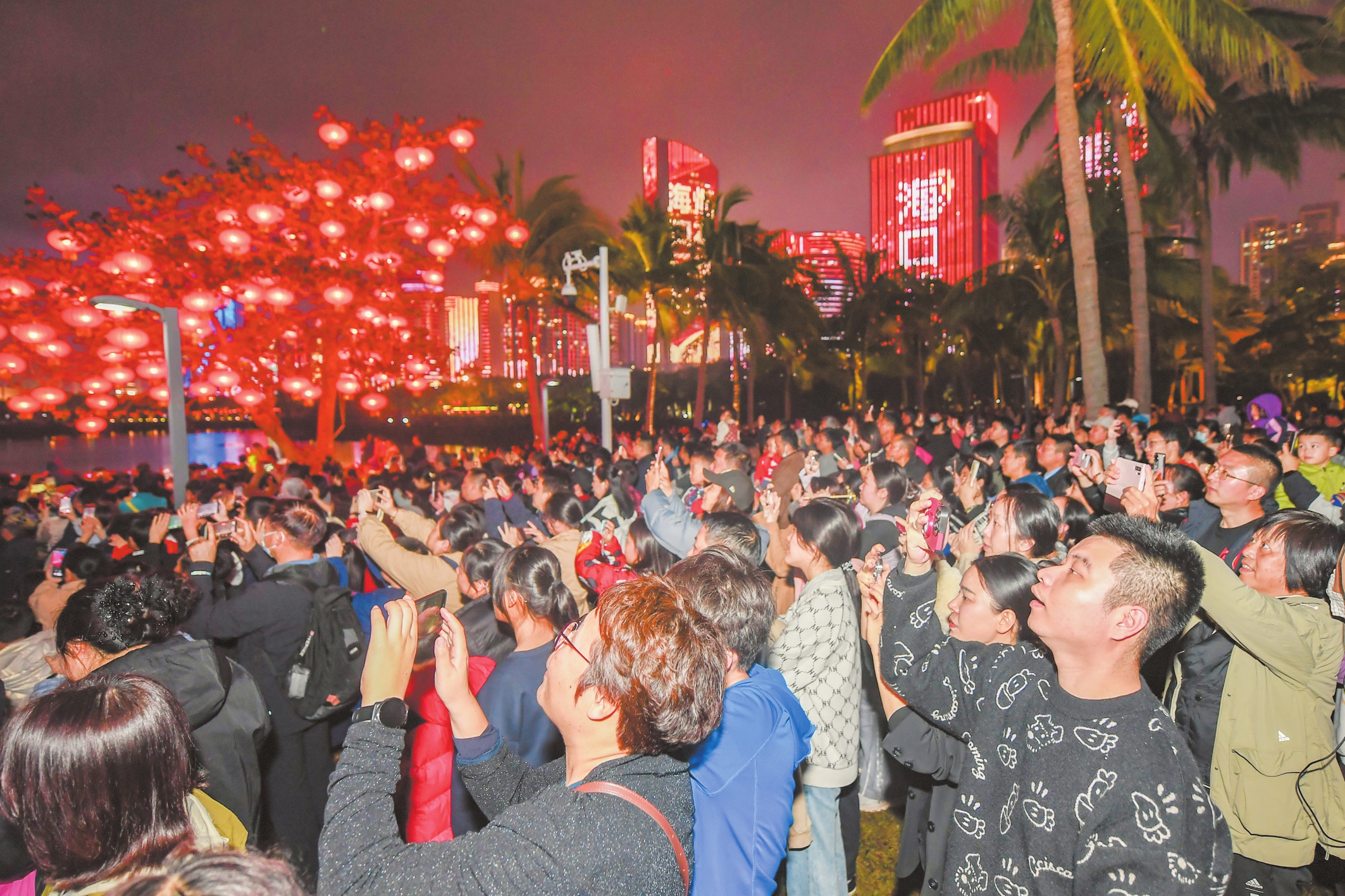 2月12日,在海口万绿园,烟花表演吸引市民游客驻足观看。本报记者 孙士杰 摄