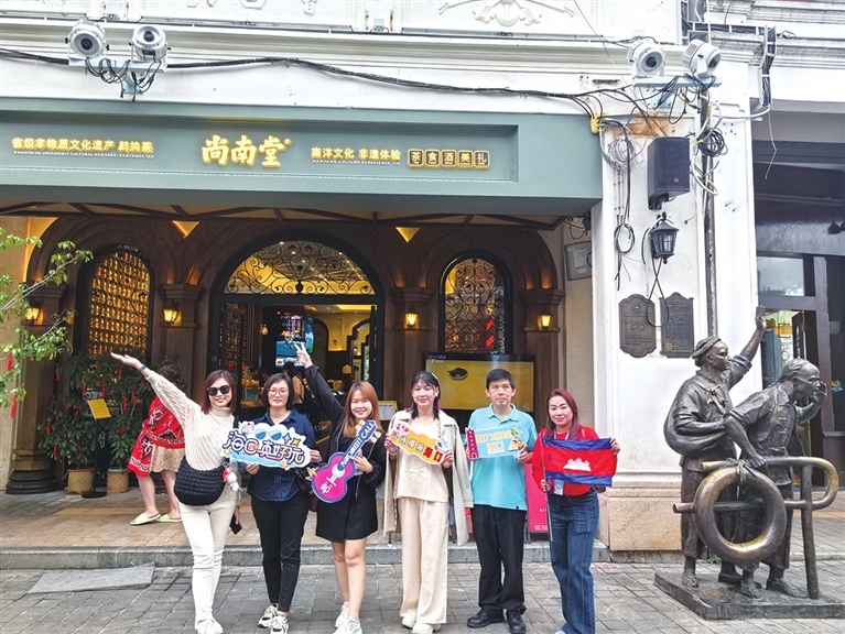 柬埔寨首发团游客打卡海口骑楼老街。(受访者供图)