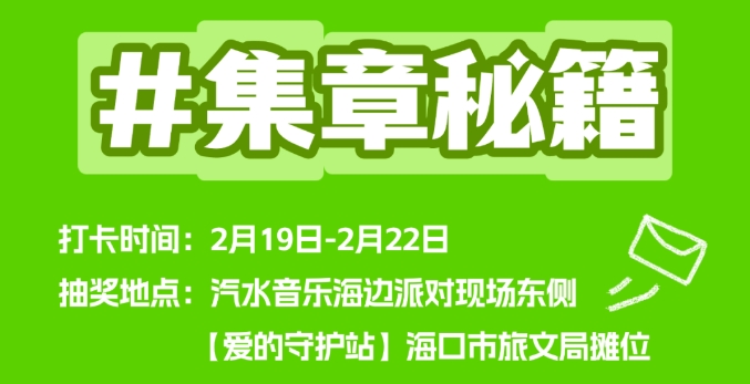 2.集满5-10个印章即可在汽水音乐海边派对现场东侧【爱的守护站】海口市旅文局摊位上进行抽奖。