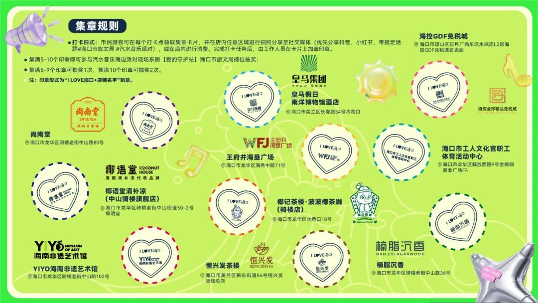 1.打卡形式:市民游客可在每个打卡点领取集章卡片,并在店内任意区域进行拍照分享至社交媒体(带指定话题#海口市旅文局 #汽水音乐派对),或在店内进行消费,完成打卡任务后,由工作人员在卡片上加盖印章。