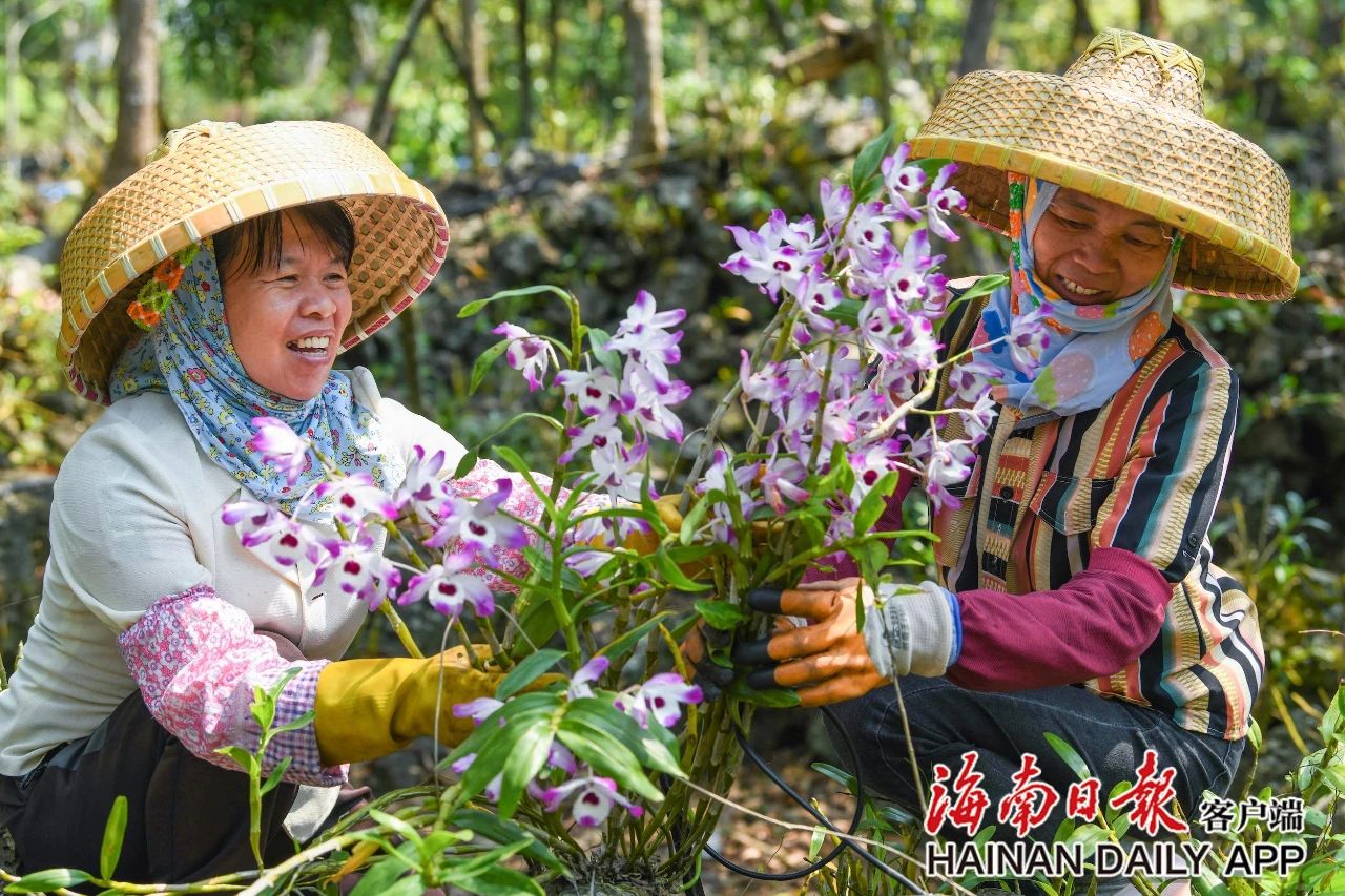 海口市秀英区石山镇施茶村的火山石斛园里,村民在管护石斛花。海南日报全媒体记者 王程龙 摄