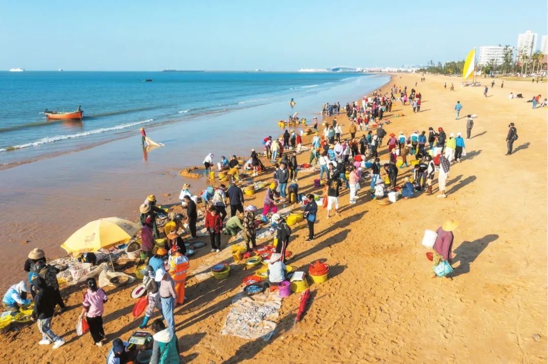 鱼市是荣山寮村的特色文旅项目。每当渔船集体捕鱼回来,荣山寮村的沙滩上就形成了热闹的鱼市。去年8月16日,荣山寮村举办首届开渔季活动,三天累计接待游客约4万人次,带动经济收益120万元。