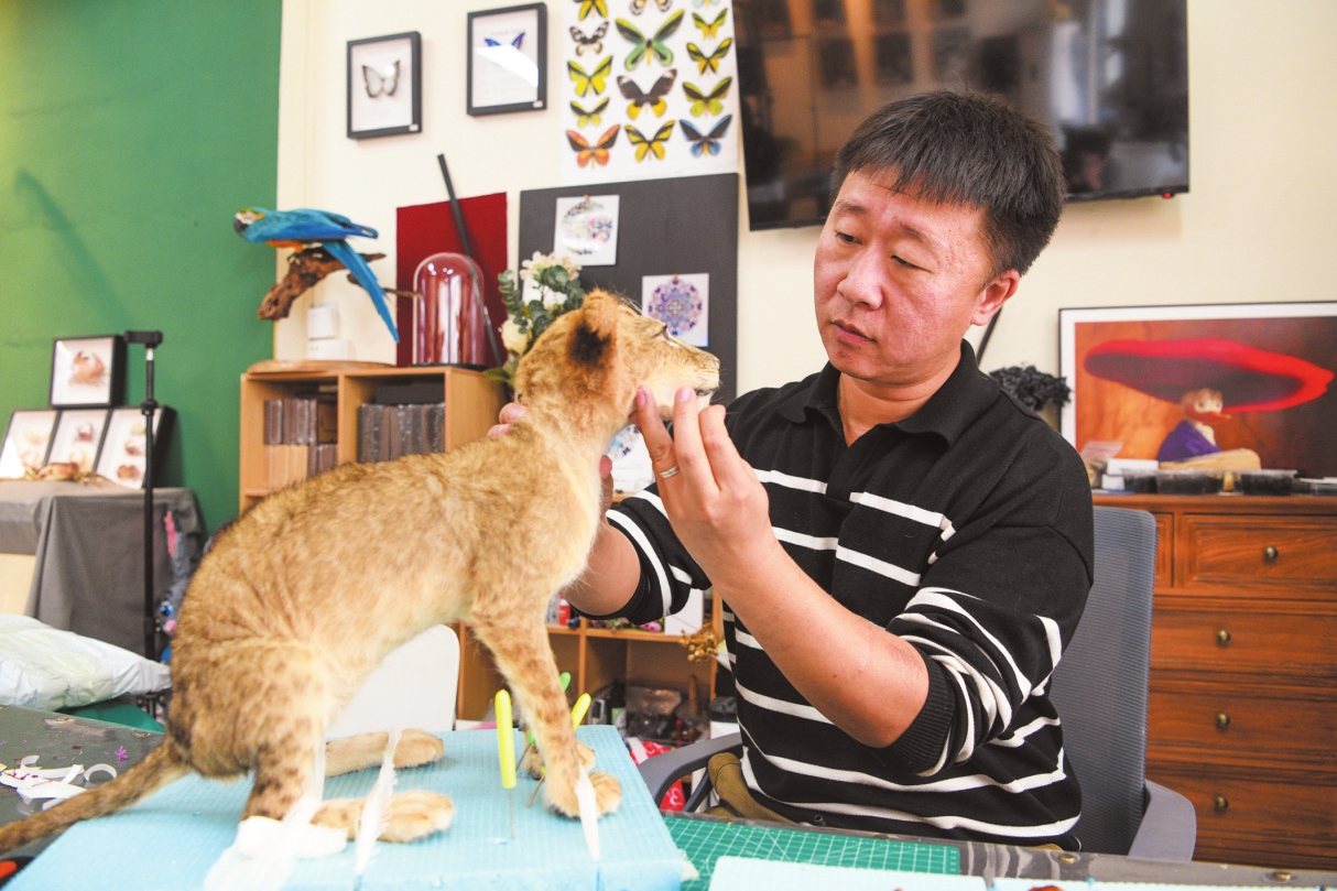 在898艺术村,标本师郑人赫认真制作动物标本。本报记者 杨鹤 摄