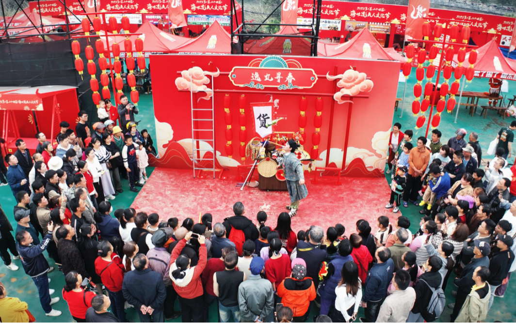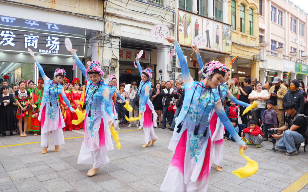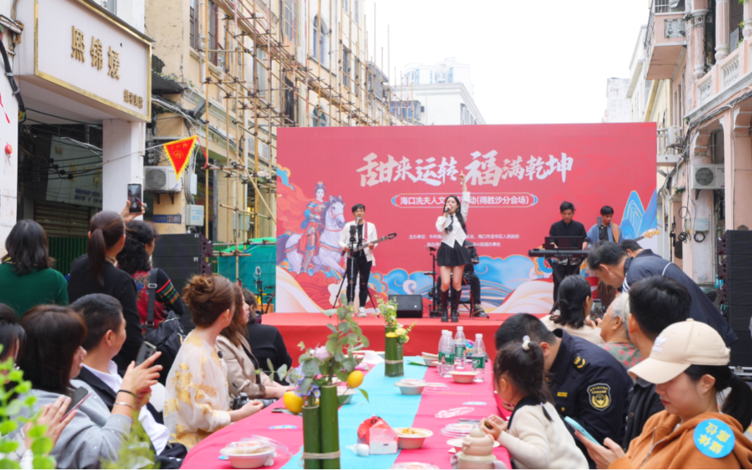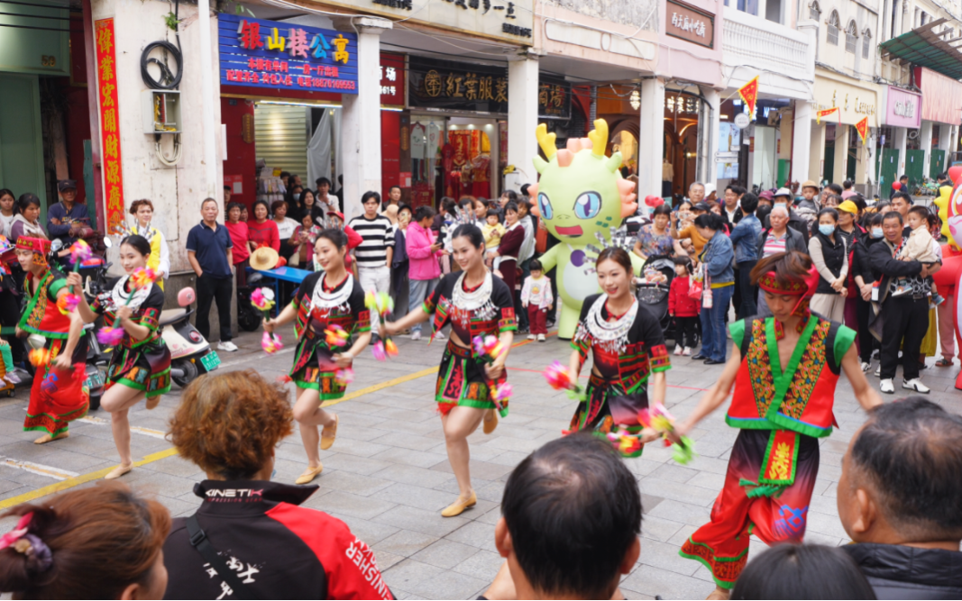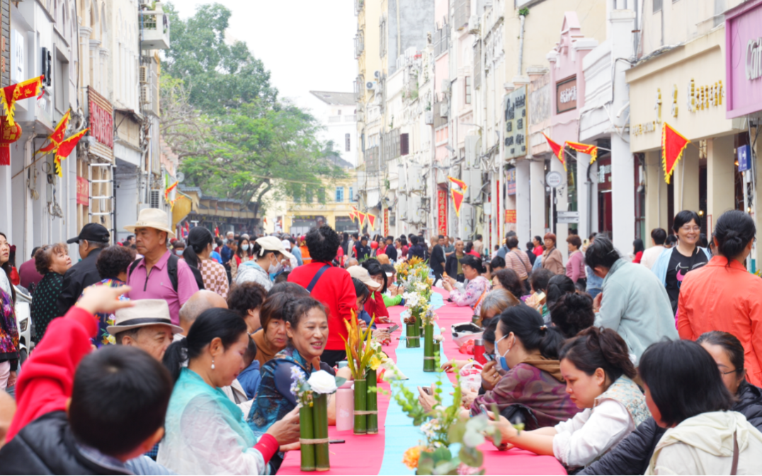 在中山街道(得胜沙路)开展的祈福、琼剧、乐队表演、趣味游戏以及糖水长桌宴活动,也吸引了市民游客积极参与。而在城西镇、遵谭镇分会场也开展了斋戏演出、舞龙舞狮等民俗活动,为市民游客带来一波又一波欢乐热潮。