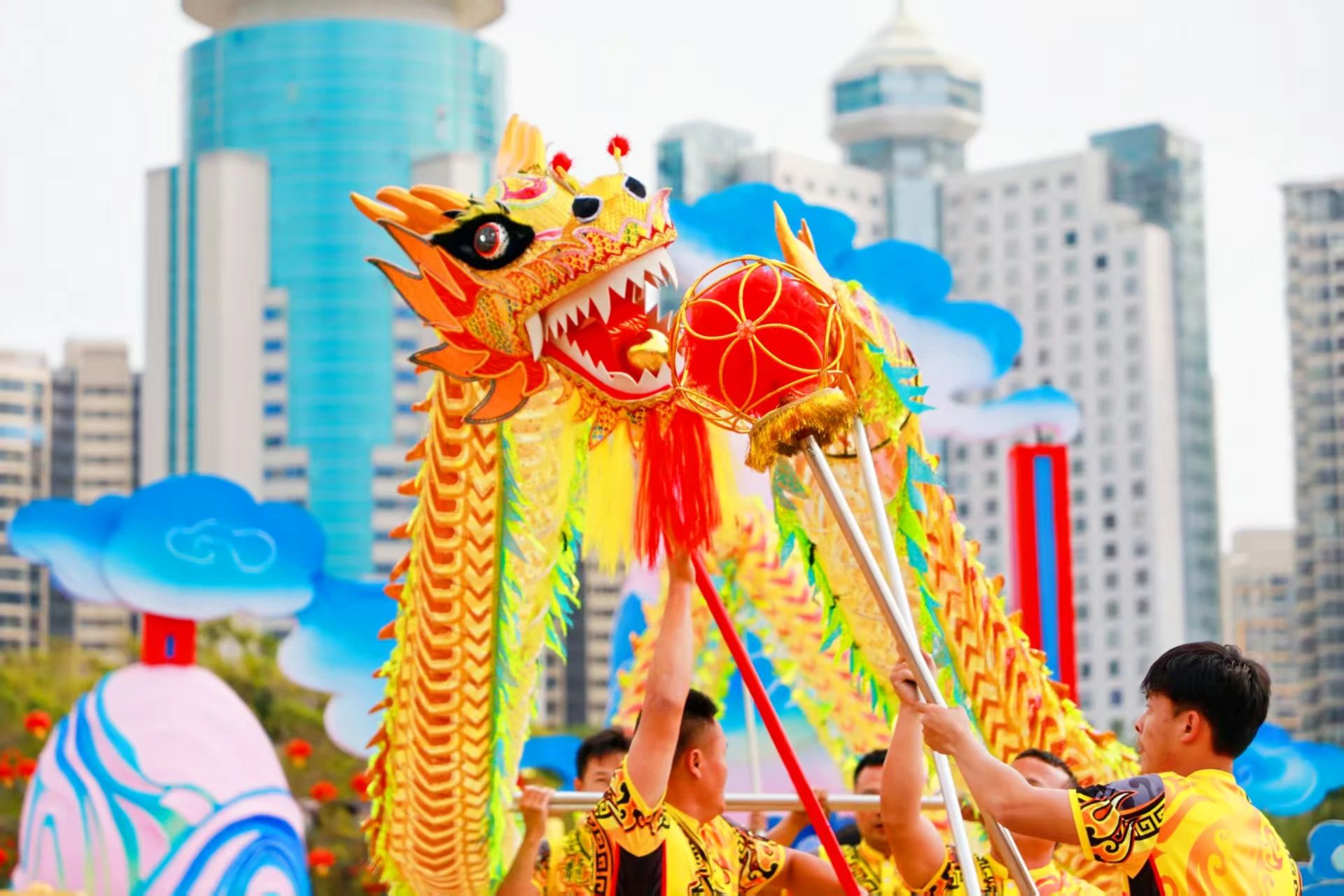 龙舞是我国汉族的民间舞蹈,因舞蹈者手持龙形道具而得名。舞龙时,龙跟着绣球做各种动作,不断地展示扭、挥、仰、跪、跳、摇等多种姿势,祈求平安和丰收,是一种颇具传统的民俗文化。逢年过节,在海口老街,街坊乡里的民众都喜欢扎龙、舞龙,尤其是以龙文坊的舞龙活动著称。