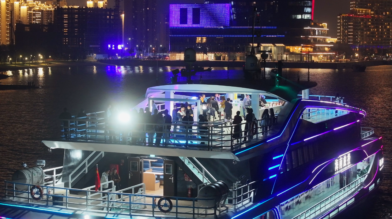 海风习习,海旅01游船载着考察团从东坡老码头启程,途经世纪大桥、云洞图书馆、天空之山等多个城市地标建筑及景观。更具惊喜的是,刚参加完第十届旺代单人不间断环球帆船赛的徐京坤船长也亲临考察现场,一同与考察团从海上看海口,感受夜游海口的浪漫。
