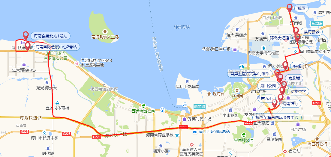 1、经停站点。往程,祗园、福海新城、环岛大酒店、钟楼、省第五医院龙华门诊部、泰龙城、海口公园、义龙中学、市九中、海南银行、海南会展北站1号站;返程,海南国际会展中心2号站(最外侧通道)、国宾大厦1号站、市九中1号站、海口公园、泰龙城、省第五医院龙华门诊部、钟楼、环岛大酒店、福海新城、祗园。