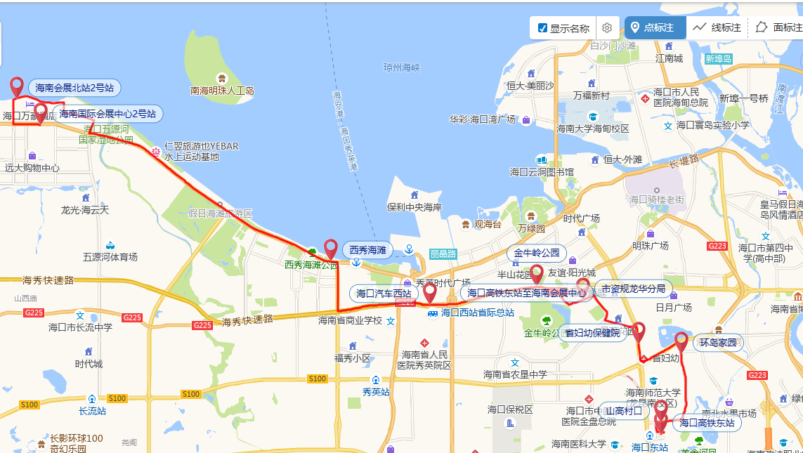 1、经停站点。往程,海口高铁东站、山高村口、环岛家园、省妇幼保健院、市资规局龙华分局、金牛岭公园、海口汽车西站、西秀海滩、海南会展北站2号站;返程,海南国际会展中心2号站(最外侧通道)、西秀海滩、海口汽车西站1号站、金牛岭公园、市资规局龙华分局、和信广场、环岛家园、山高村口、海口高铁东站。