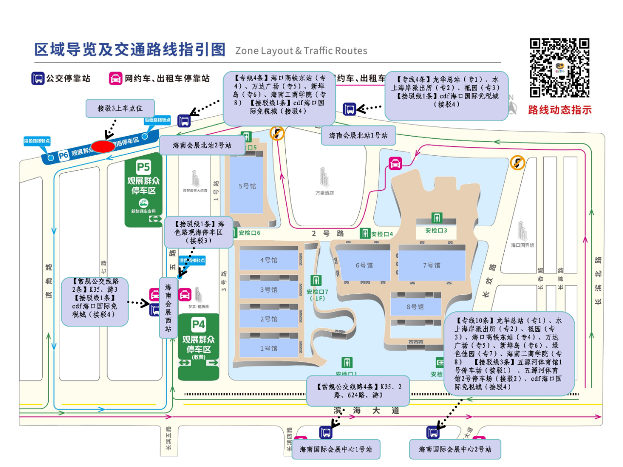 (二)乘车站点。消博会期间,消博会期间,展会周边设置海南会展北站1号站、海南会展北站2号站、海南会展西站、海南国际会展中心1号站、海南国际会展中心2号站等5个公交站点和1个出租车上落客区域(海南国际会展中心北广场)。海口公交将安排工作人员及志愿者驻点值守,疏导乘车秩序、应急处置和提供问询服务。