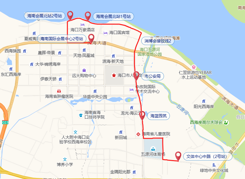 2、离开海南国际会展中心:8条公交专线、2条五源河体育场接驳线均停靠滨海大道南侧的“海南国际会展中心2号站”。