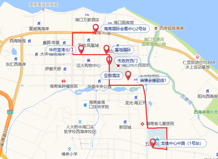 (五)消博会专线5,万达广场至海南国际会展中心,配置公交车10辆,往返程共经停18个站点。