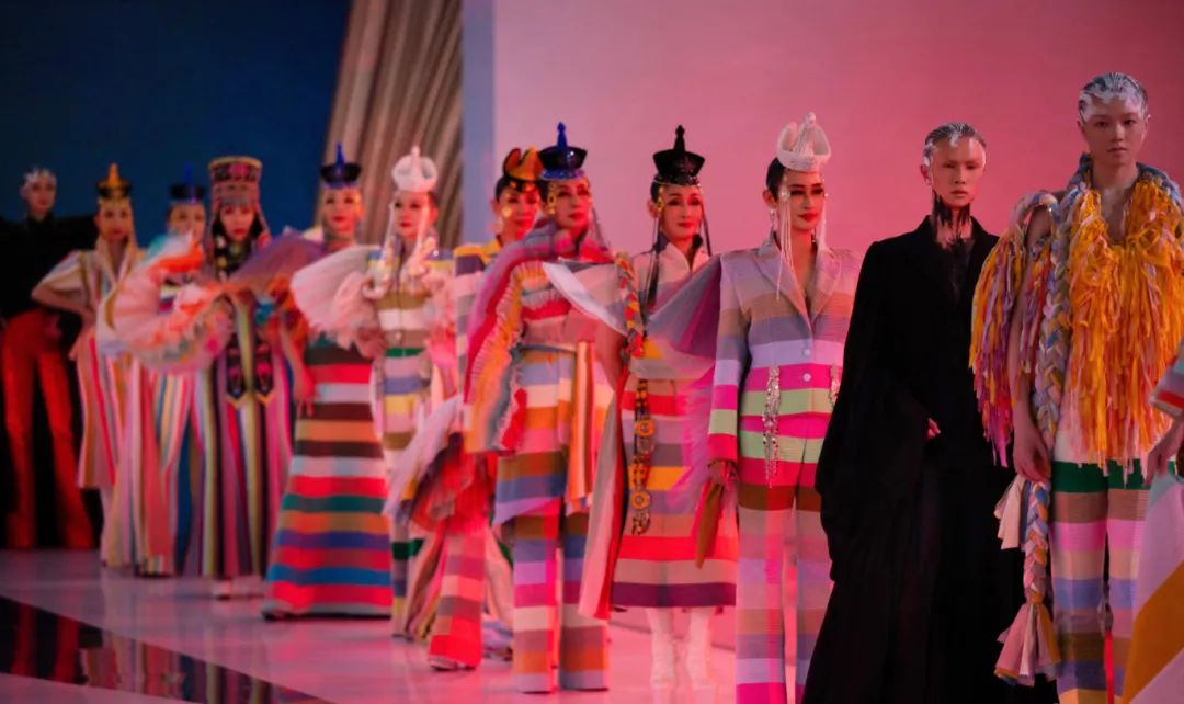 当梵高的《星空》遇见蒙古的敖包经幡,当螺旋的星云化作藏族吉祥结的图腾......在中免秀场1F秀场,设计师胡社光打破高定时装与日常生活的界限,用160种多巴胺色彩,用HAUTE COUTURE的手工温度,为现场观众带来一场东西方文化交融的对话。
