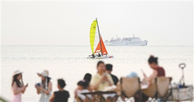 5月6日,在海口秀英区荣山寮村金沙湾公园,市民游客漫步在细腻的沙滩上,欣赏落日余晖,或体验帆船、桨板等水上运动,悠然享受美好时光。