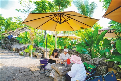 近日,在海口石山镇火山岩古村落三卿村,游客漫步古村,品茶休憩,沉浸式体验火山文化。