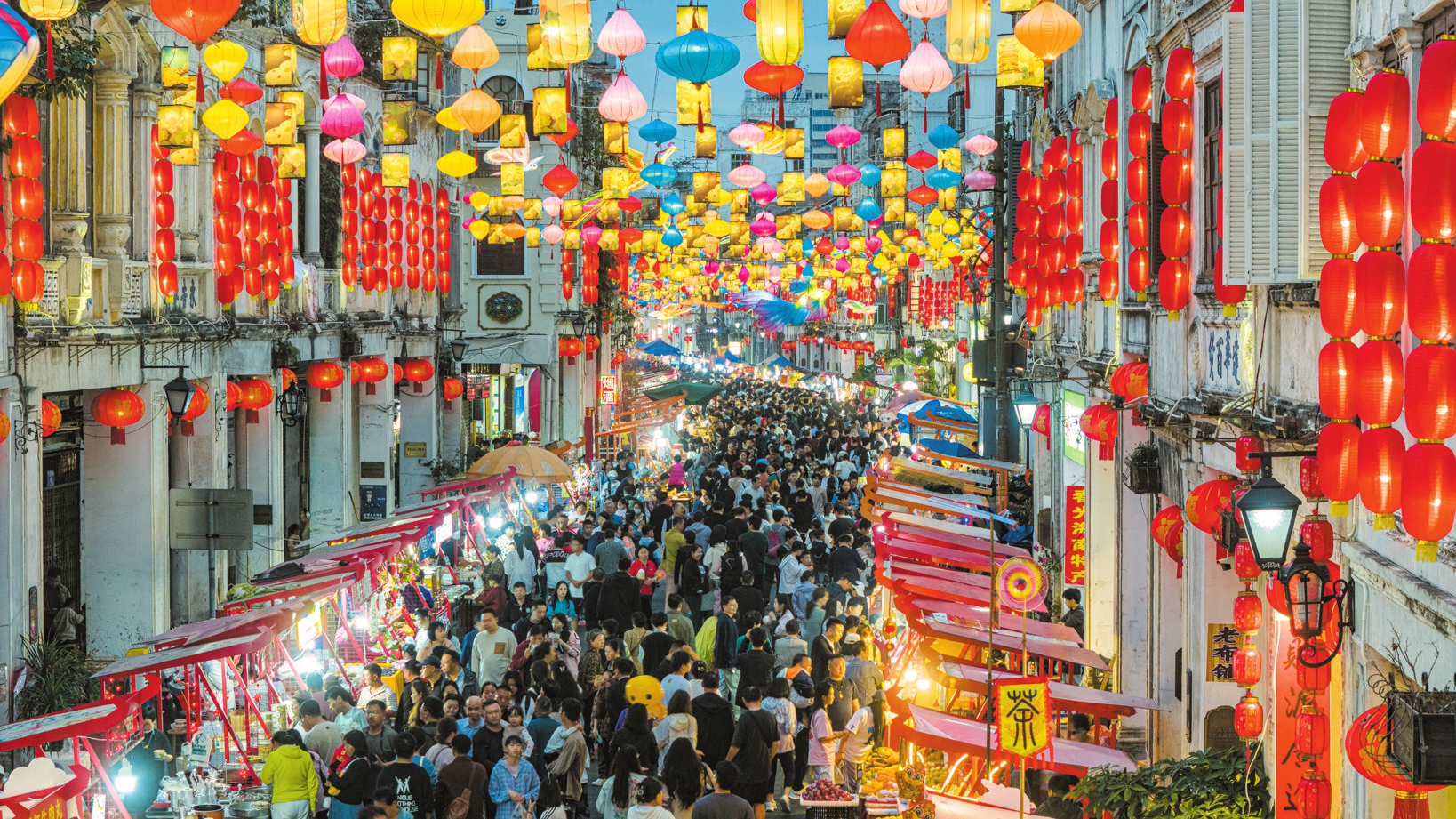 在海口骑楼老街,传统的骑楼建筑结合着绚丽的彩灯造景与丰富的商业业态,吸引了众多市民游客前来游玩。 本报记者 苏弼坤 摄