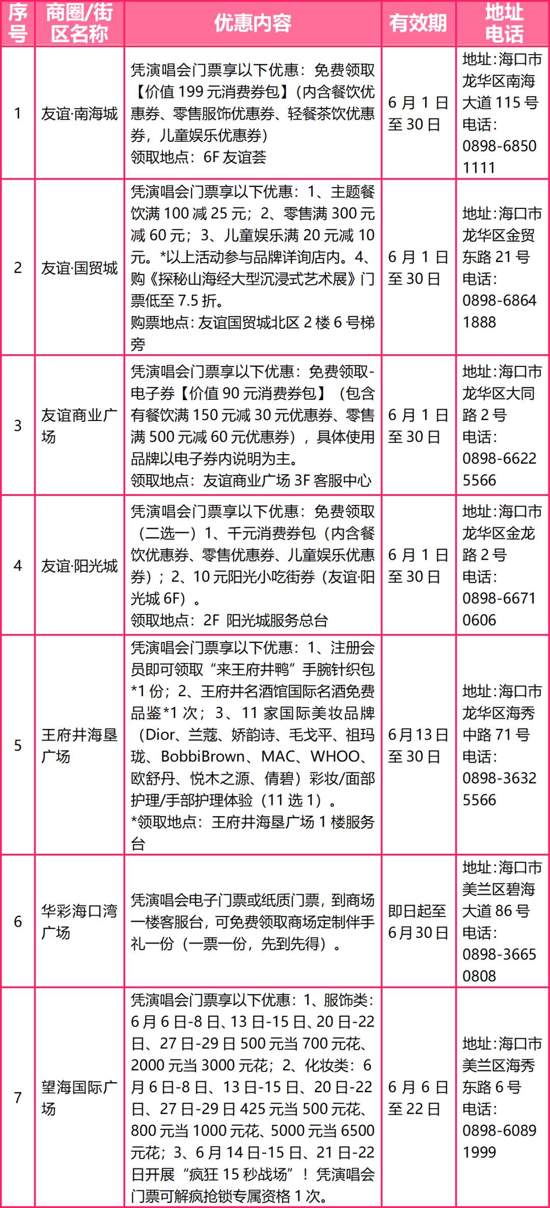 商圈X演唱会共狂欢,让热爱不止在舞台!海口重点商圈在演唱会期间将推出凭演唱会门票享专属折扣、消费满减等活动,为来自全国各地的歌迷营造浓厚的消费氛围。