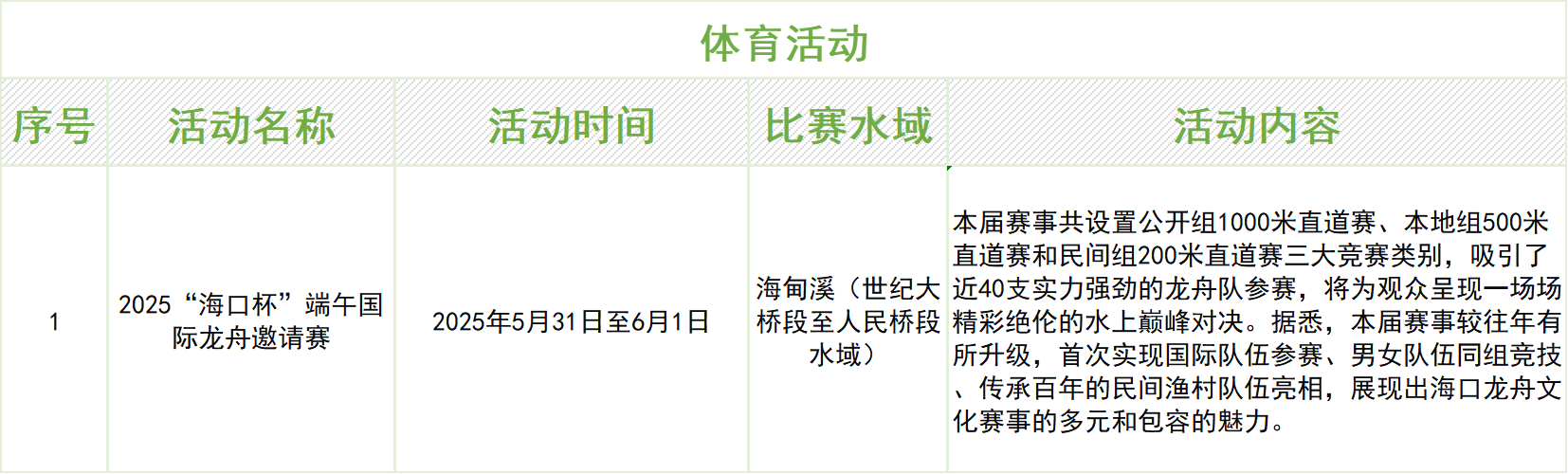 2025“海口杯”端午国际龙舟邀请赛强势来袭,将于5月31日-6月1日在海甸溪(世纪大桥段至人民桥段水域)正式开赛!本届赛事共设置公开组1000米直道赛、本地组500米直道赛和民间组200米直道赛三大竞赛类别,吸引了近40支实力强劲的龙舟队参赛,将为观众呈现一场场精彩绝伦的水上巅峰对决。市民游客可前往海甸溪沿岸现场见证传统文化中的力量美学,也可以在焕新亮相的东坡老码头,一边细品美食,一边沉浸于赛龙舟的热闹氛围~
