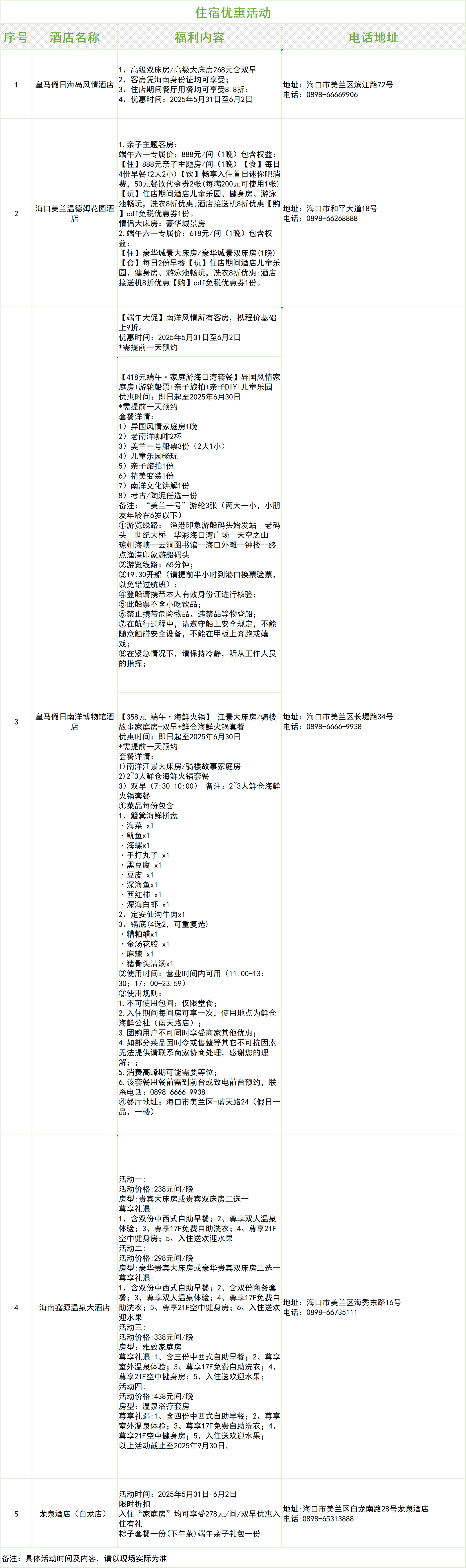 皇马假日南洋博物馆酒店端午期间客房携程价9折优惠,还有家庭游海口湾、海鲜火锅等特色套餐满足多样需求。海南鑫源温泉大酒店,238元起享住宿、早餐、温泉、健身等服务。龙泉酒店(白龙店)278元享家庭房含双早,入住即赠粽子套餐与亲子礼包。舒适住宿+特色美食+贴心服务,承包你的完美假期!