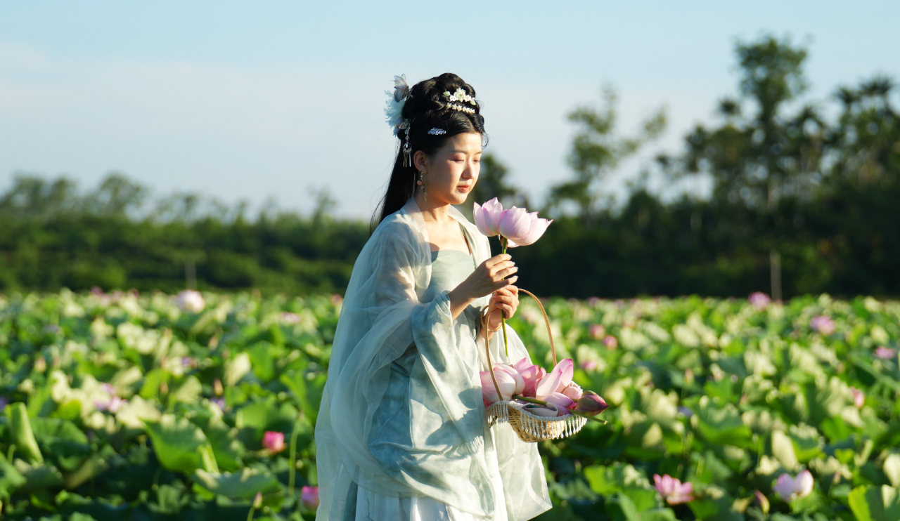 端午正值荷花初绽,在琼山区旧州镇西山村池连莲子产业园内,400多亩荷塘碧叶连天,粉白相间的荷花随风摇曳,欢迎市民游客前来赏荷打卡、清凉度夏。还可以身着汉服漫步在荷花丛中,感受微风拂面,体验“荷叶罗裙一色裁”的诗意场景。