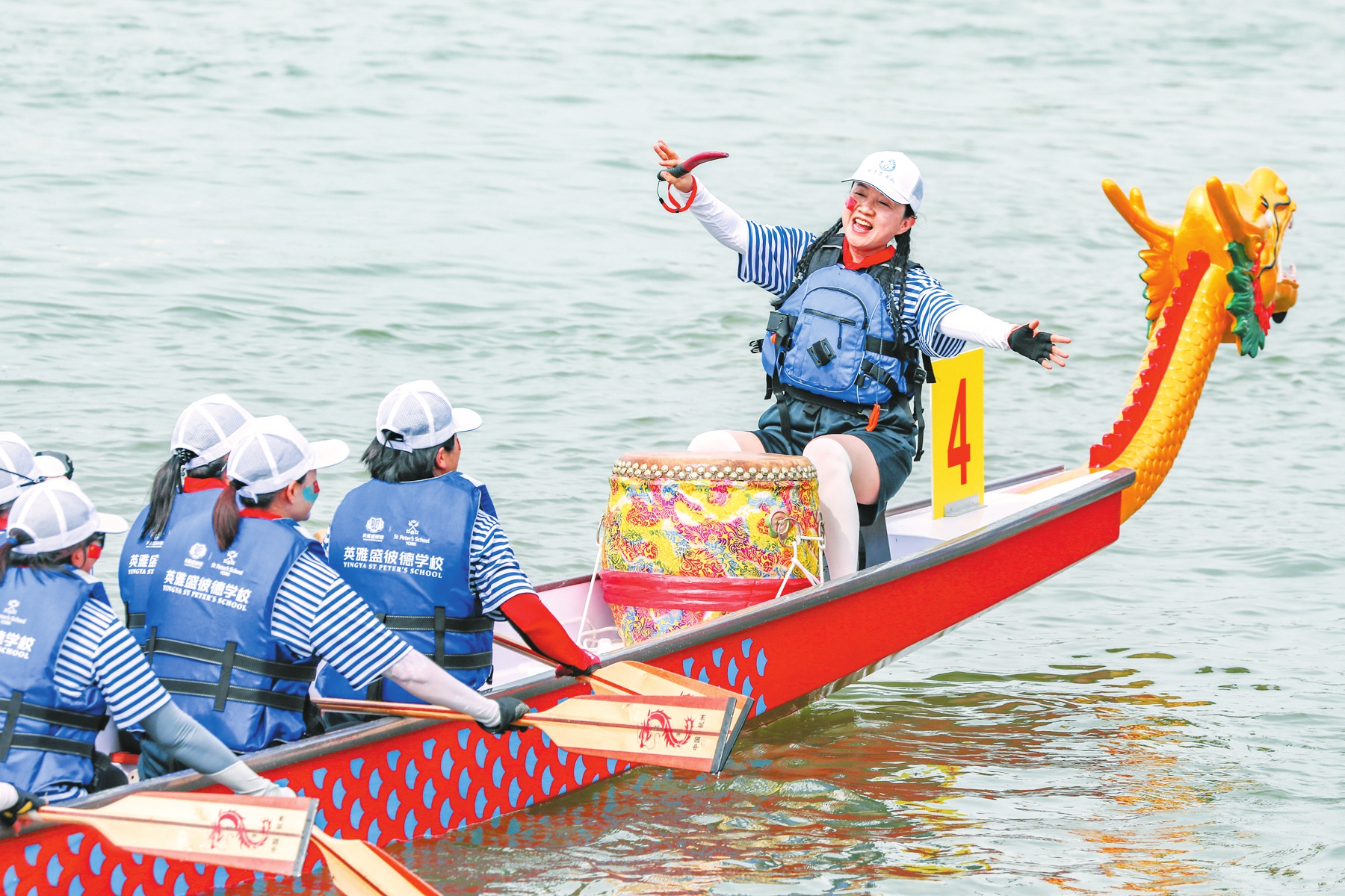 6月1日,比赛结束后,女子龙舟队鼓手带领队员唱起《欢迎你到海南来》。本报记者 孙士杰 摄