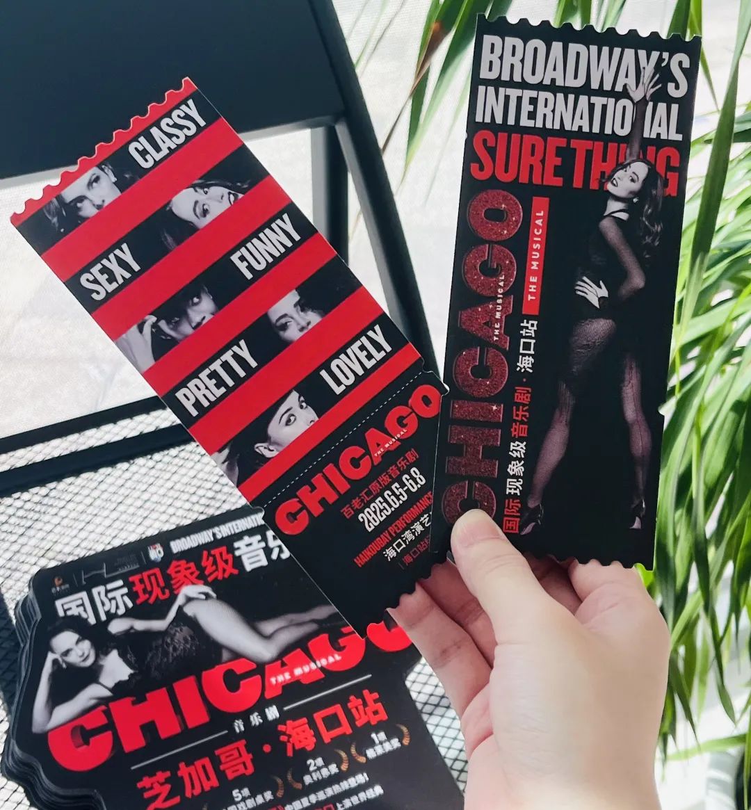 关注@海口湾演艺中心微信公众号/微博/小红书/抖音任意社交媒体账号,小红书平台发布《芝加哥》相关任意笔记,带话题#当芝加哥遇上椰城,演前1小时,凭当场演出票和社交媒体发文凭证,工作人员审核通过后,可领取芝加哥海口站限定票夹一个。