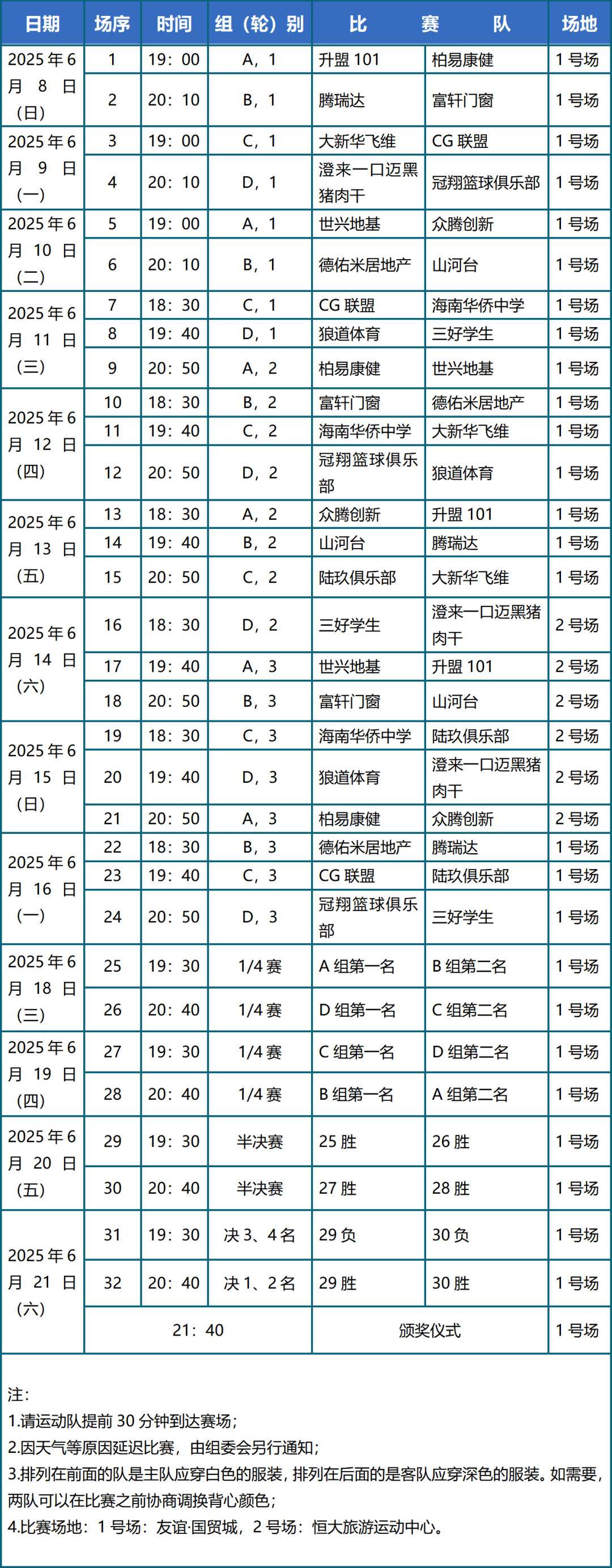 (龙华赛区)正赛赛程表