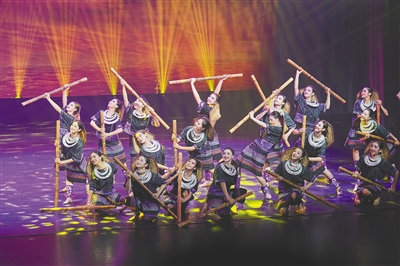 6月14日是中国文化和自然遗产日。当天,由海口市艺术团打造的原创舞蹈诗《黎族家园》在海口演艺新空间·综合剧场上演。该舞蹈诗通过演绎黎族青年男女相遇、相知、相爱的过程,融入黎锦、黎族竹木器乐、黎族原始制陶技艺等多项非遗技艺元素,展现海南黎族同胞的生活图景与文化传承。