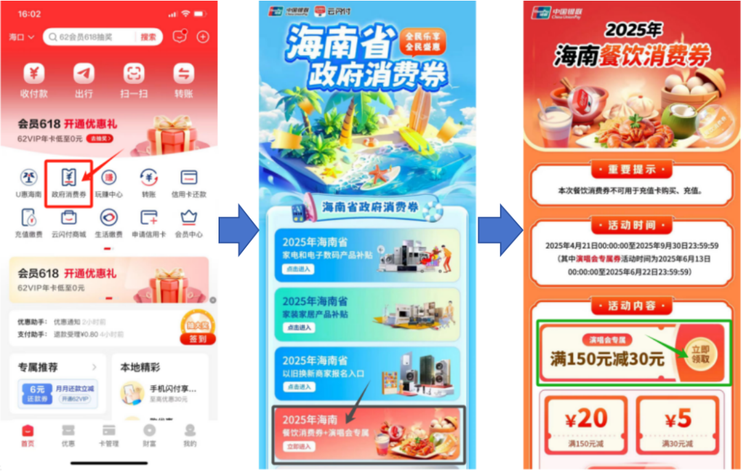 2.领券路径:云闪付App首页“政府消费券—餐饮消费券+演唱会专属”专区。