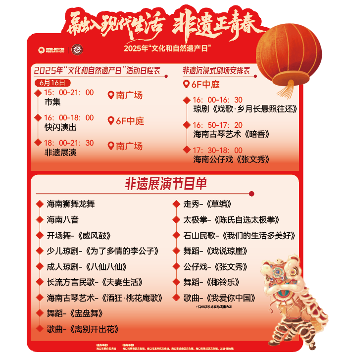 2025年“文化和自然遗产日”即将到来。今年,海口市群众艺术馆联合各区文化馆及友谊·阳光城,以“融入现代生活——非遗正青春”为主题,通过“可吃、可玩、可赏、可学”的沉浸式体验,让不同年龄阶段的您,都能在现代商业空间中,近距离感受海口非遗的烟火气与生命力,找到不一样乐趣。