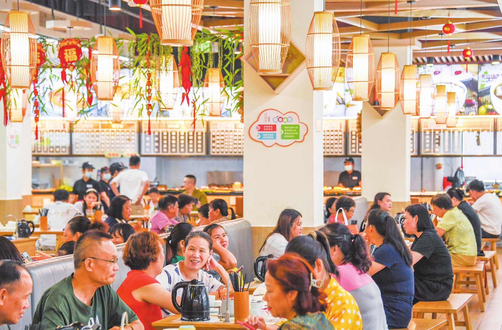 龙湖海南海口天街的聚福安老爸茶店内,装潢设计融合了现代简约与南洋风情,海南特色文化元素点缀其间,精致的“氛围感”吸引了许多年轻群体光顾。扫描二维码点单、手机团购优惠套餐……相较于传统老爸茶店,在这里,更多顾客选择方便快捷的手机点单方式,“44元的套餐包含紫菜卷、叉烧包、绿豆汤和柠檬茶,人均消费才20元出头,性价比很高,这里环境也适合拍照聊天。”大学生李彤一边用手机记录美食一边说道。