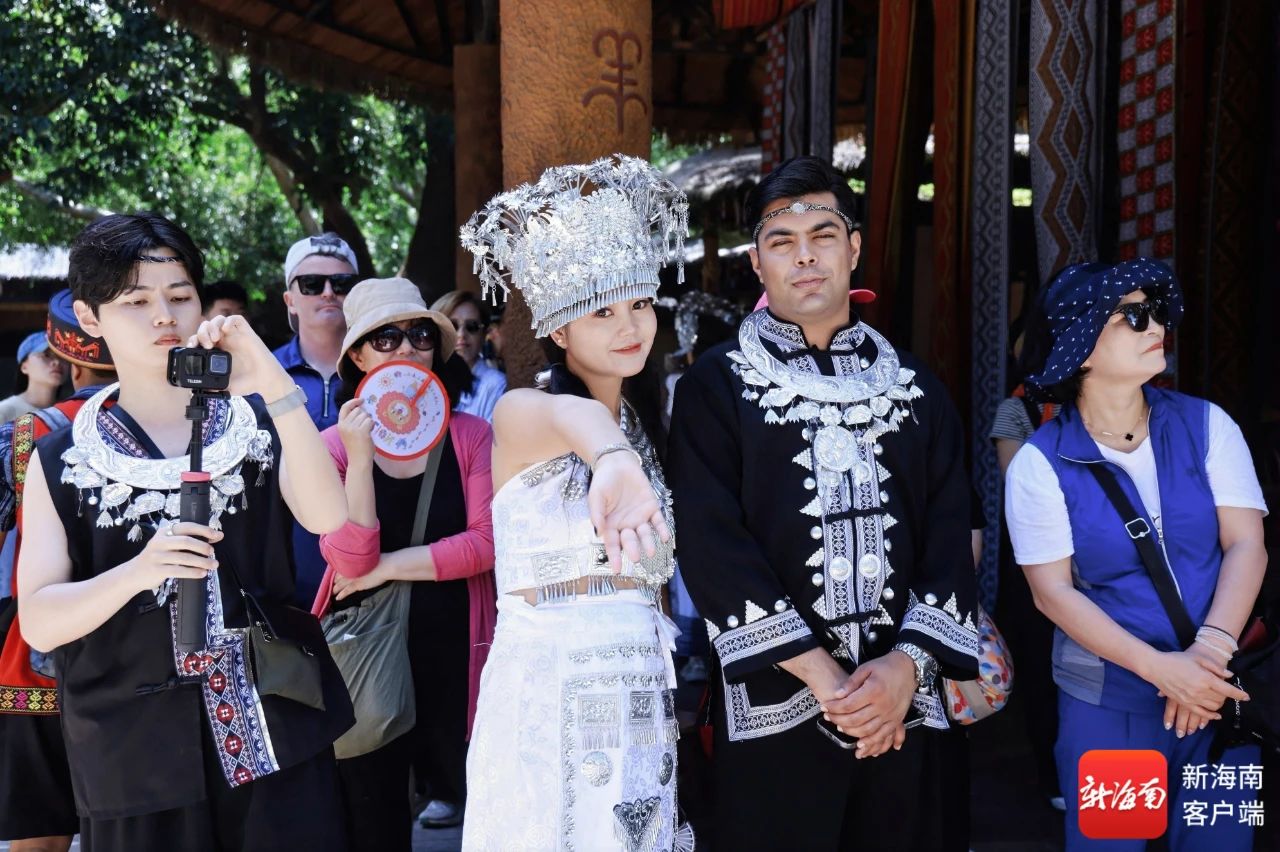 多国博主在保亭槟榔谷黎苗文化旅游区互动打卡。