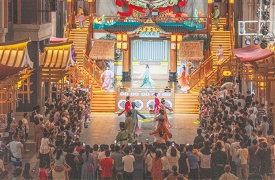 7月5日,海口东坡老码头热闹非凡,不少市民游客在观看演出。海口东坡老码头是国内首个沉浸式东坡文化生活街区,为市民游客营造一站式“东坡生活美学+海南风物”创新型沉浸体验。海南日报全媒体记者 李天平 摄