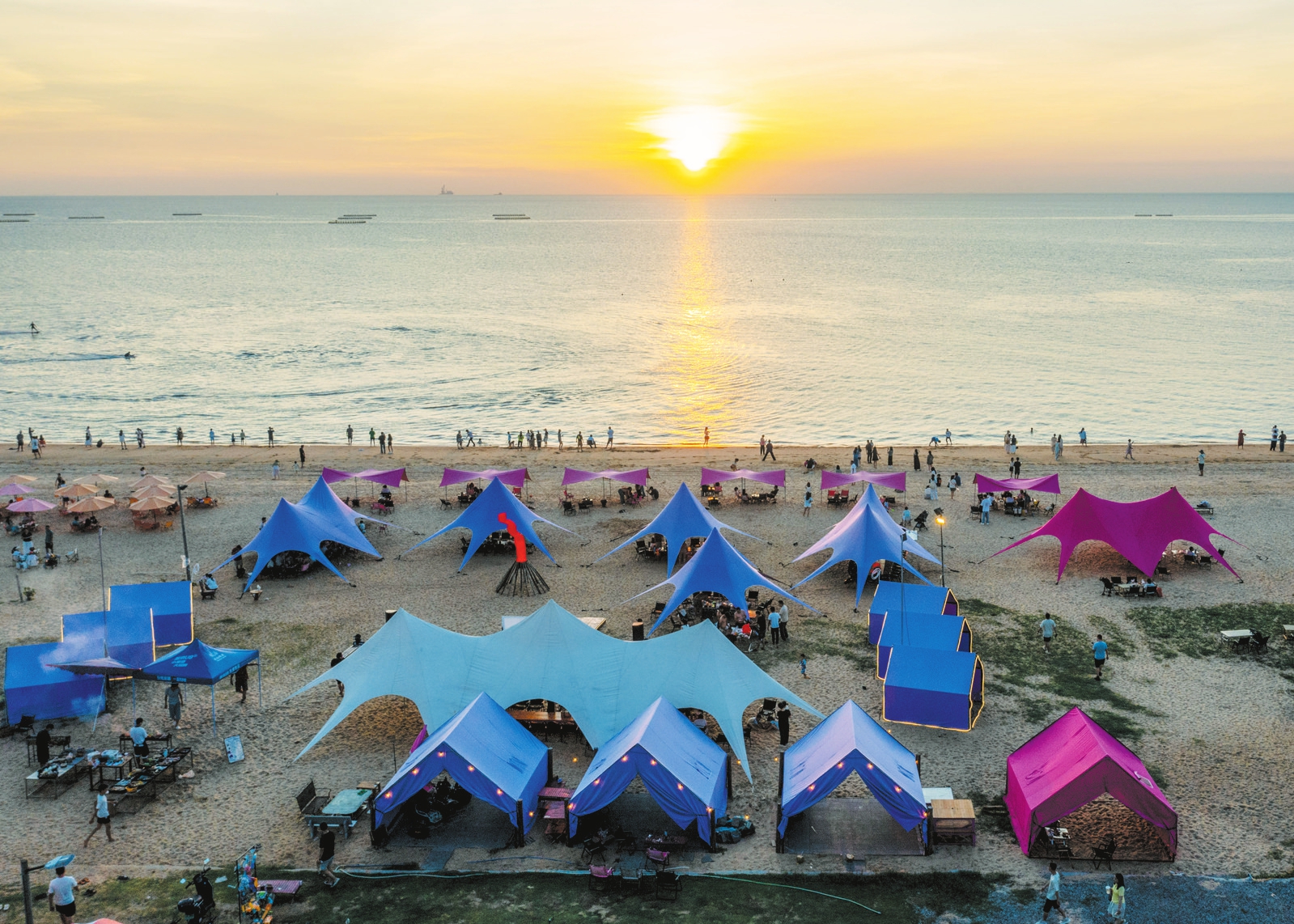 7月6日傍晚,秀英区荣山寮村热闹非凡,微暖的海风拂面,沙滩上点缀着一座座色彩绚丽的帐篷,电动冲浪板滑过碧蓝的海面,飞驰向远方……一幅惬意的海滨生活画卷在这里呈现。