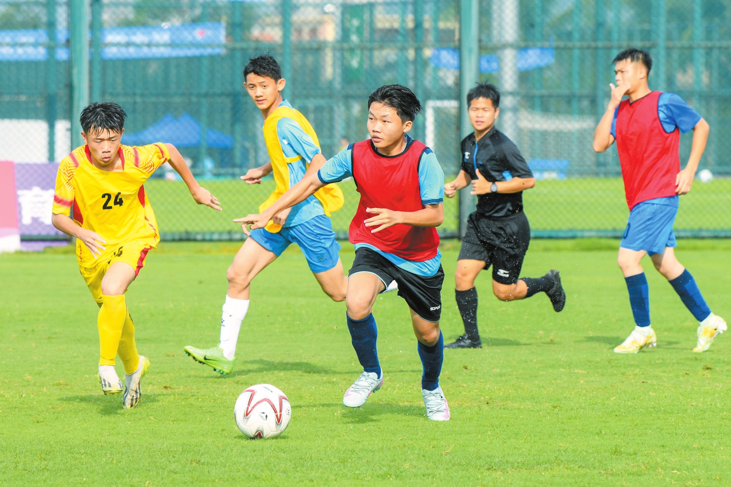 今年5月,在海口观澜湖足球基地,参加2025年海南省青少年校园足球夏令营的学员正在进行比赛。 本报记者 苏弼坤 摄