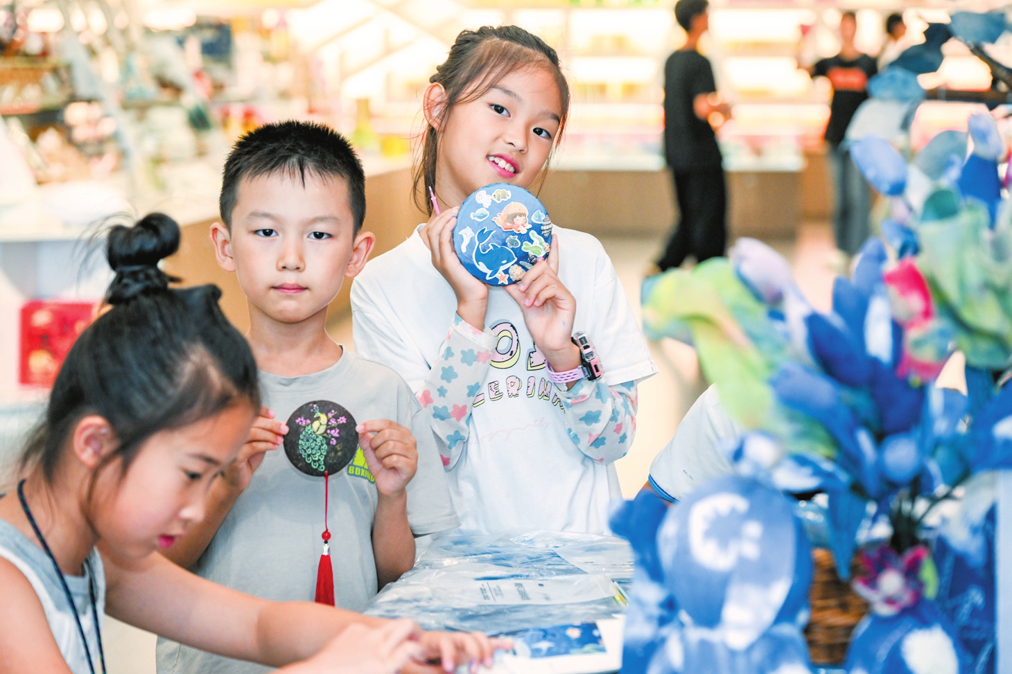 7月8日,在海南省非遗展示中心开展的暑期非遗手工活动中,孩子们展示自己的手工作品。 本报记者 苏弼坤 摄