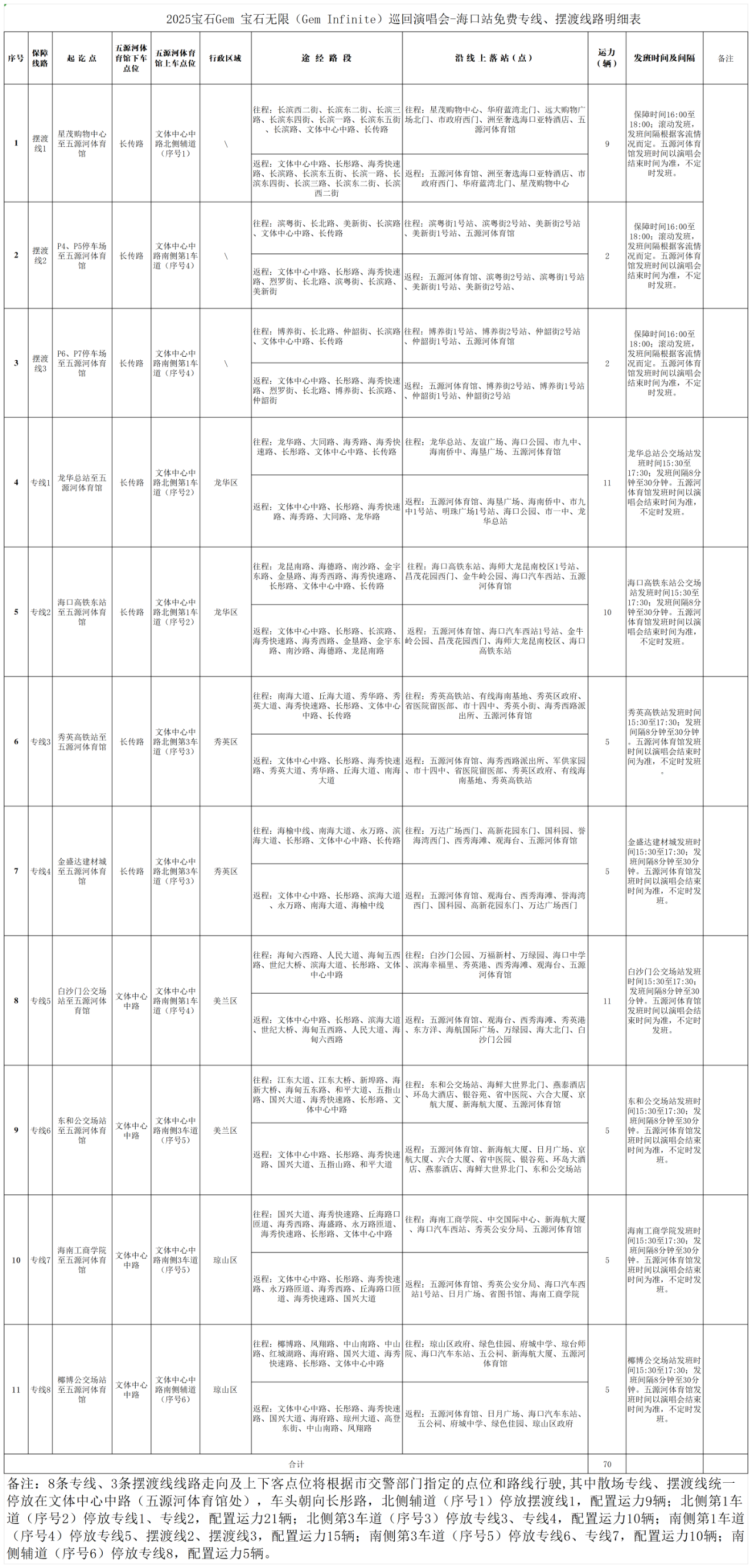 7月20日,大型演出活动将在海口五源河体育馆举行,为确保演出活动期间海口道路交通安全畅通,有效缓解长滨路及周边道路交通压力,海口公交通过开通11条免费公交专线、加大常规公交发班密度、动态调度出租运力等方式,全力保障观演群众公共交通出行需求。