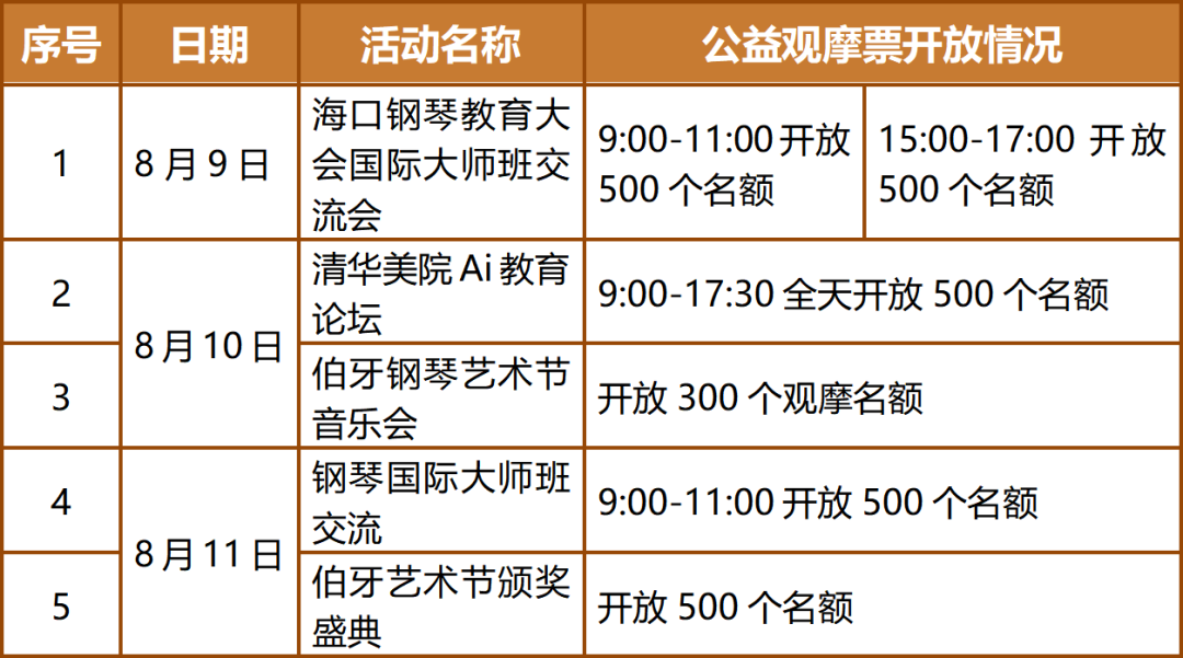 所有热爱音乐、对钢琴艺术感兴趣的市民游客注意啦!为普及钢琴艺术,活动组委会还联合海口市旅游文体局发起公益活动,特此放出部分公益观摩票,涵盖多场音乐会及大师班颁奖盛典,让大家均有机会近距离感受顶级钢琴家的艺术风采,体会音乐带来的心灵震撼。