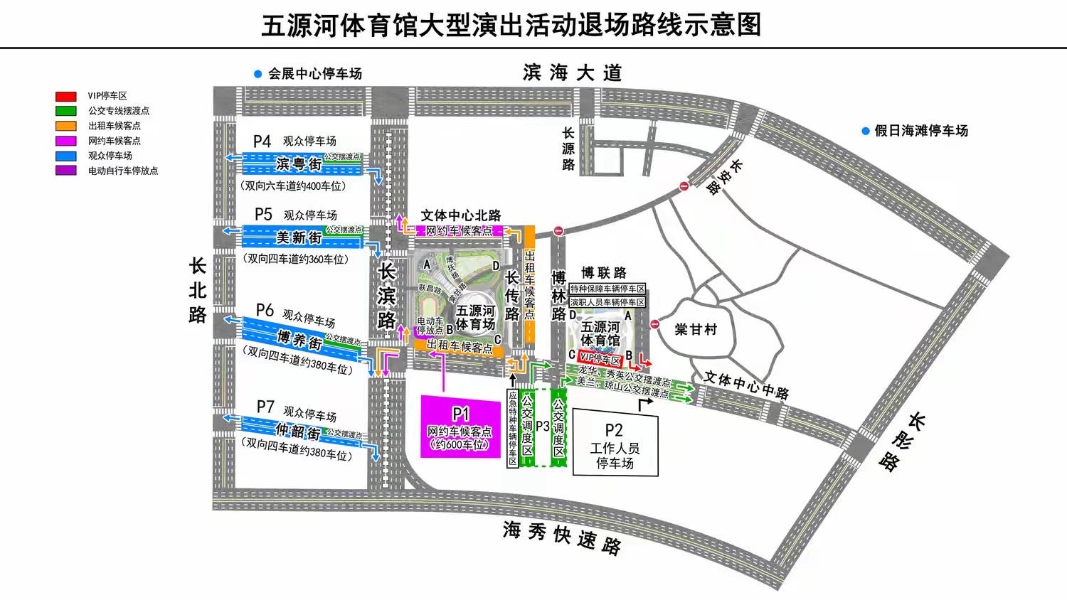 演唱会退场时,将调整文体中心中路(长传路至长彤路)实行西往东单向通行、长传路实行南往北单向通行、文体中心北路实行东往西单向通行的交通管控措施。